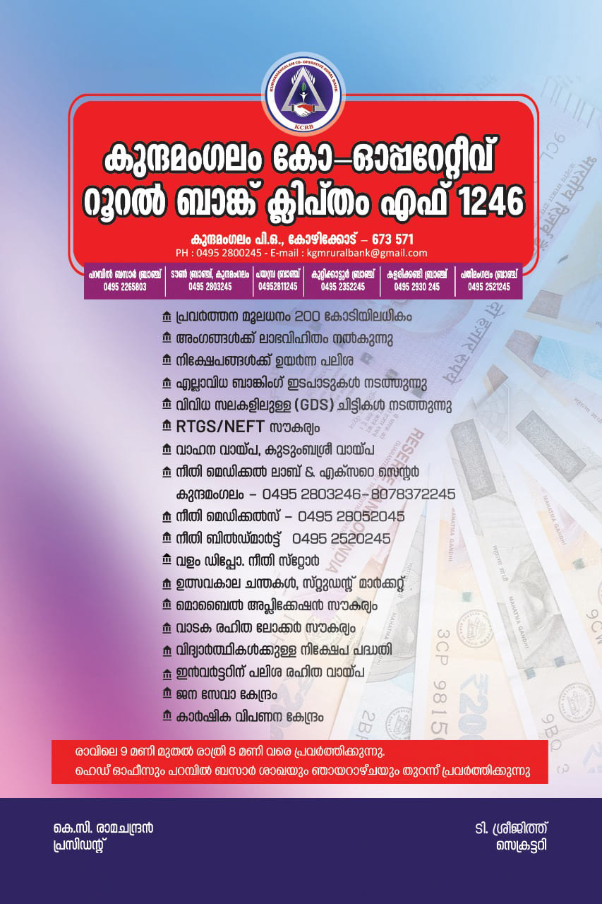 ജില്ലയിലെ പ്രമുഖ CLASS (സ്പെഷ്യൽ ഗ്രേഡ് ബാങ്ക്. പ്രവർത്തനമൂലധനം 200 കോടിയിലധികം അംഗങ്ങൾക്ക് ലാഭവിഹിതം നൽകുന്നു നിക്ഷേപങ്ങൾക്ക് ഉയർന്ന പലിശ എല്ലാവിധ ബാങ്കിംഗ് ഇടപാടുകൾ നടത്തുന്നു